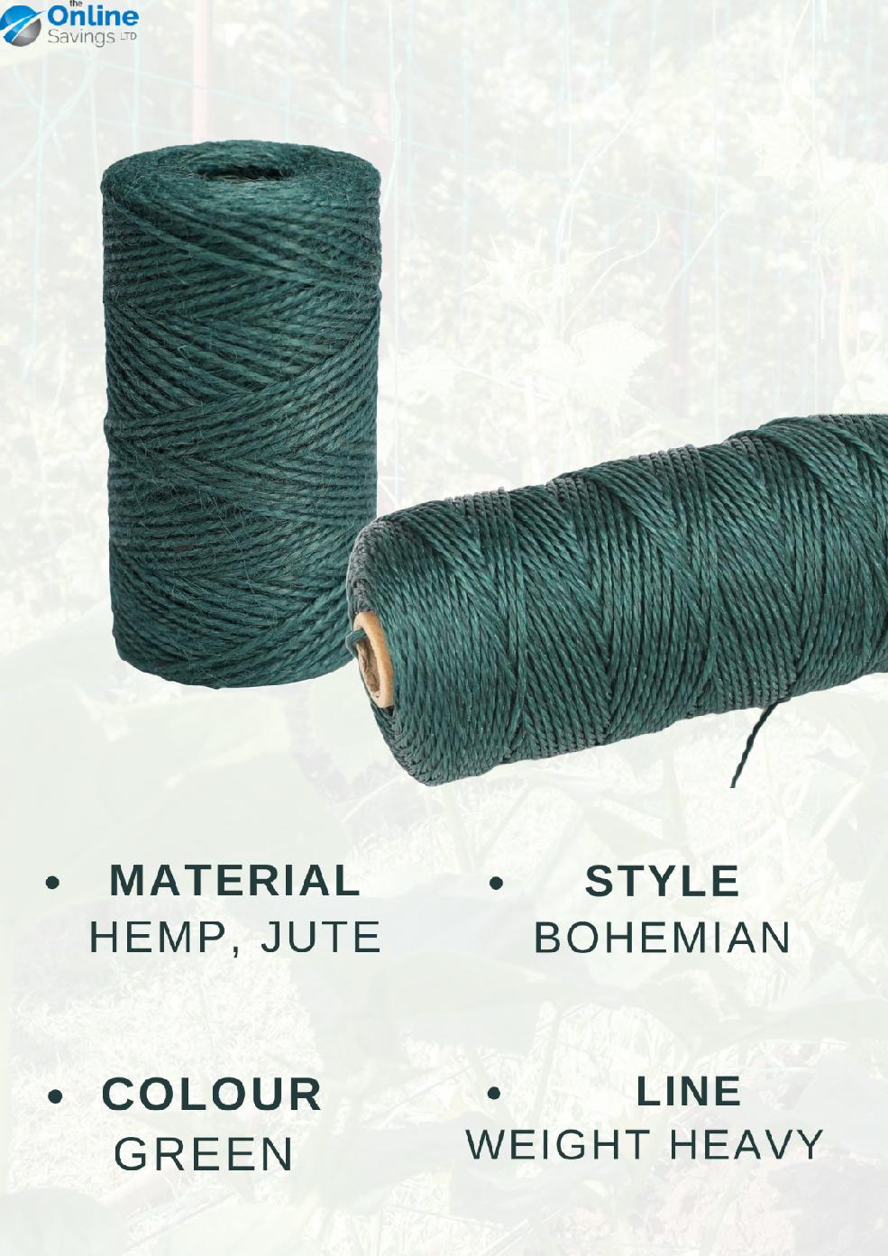 - Each roll of Dark green jute twine with the length of 100 – 200 meters that contains 3 strands of ropes with the width of 2mm respectively; long enough to meet your long time use