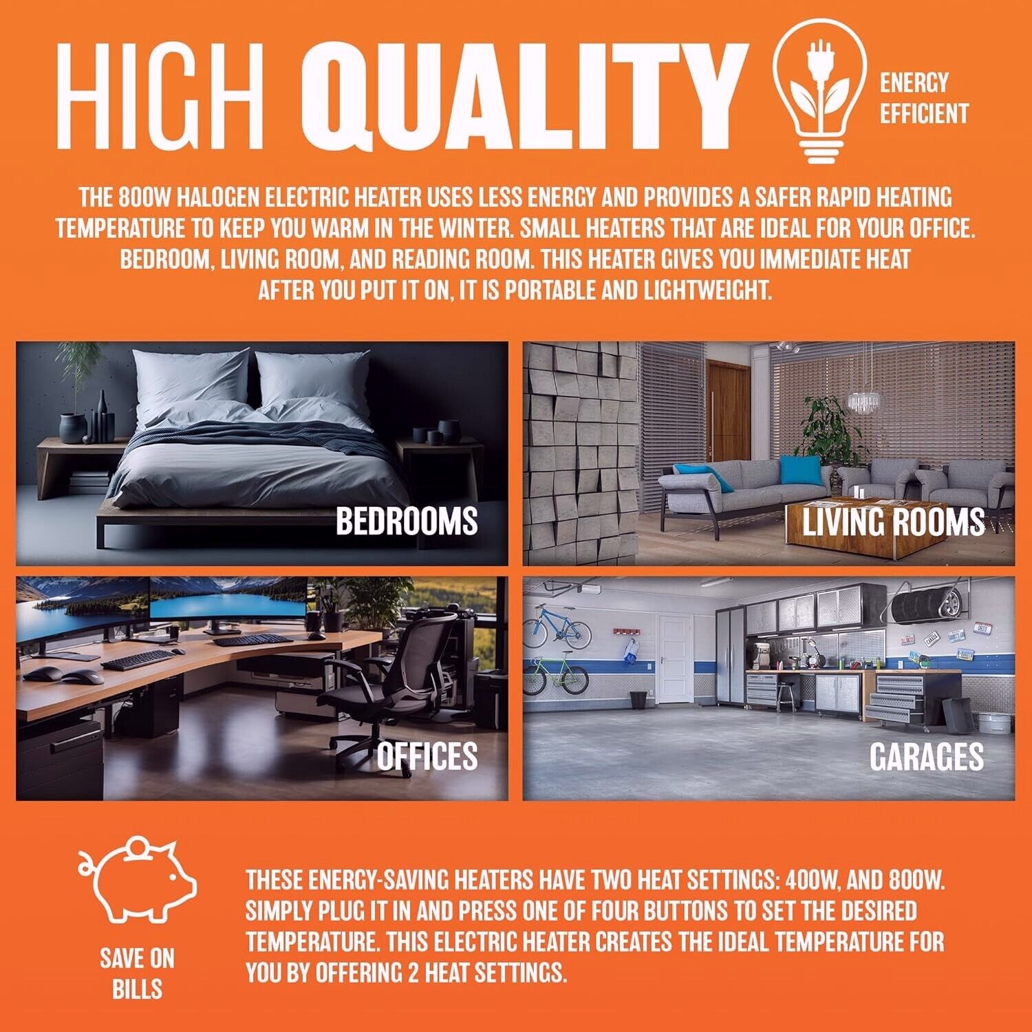 - Â ENERGY SAVING –Â The 800W halogen electric heater uses less energy and provides a safer rapid heating temperature to keep you warm in the winter. Small heaters that are ideal for your office, bedroom, living room, and reading room. This Heater gives you immediate heat after you put it on, it is portable and lightweight.